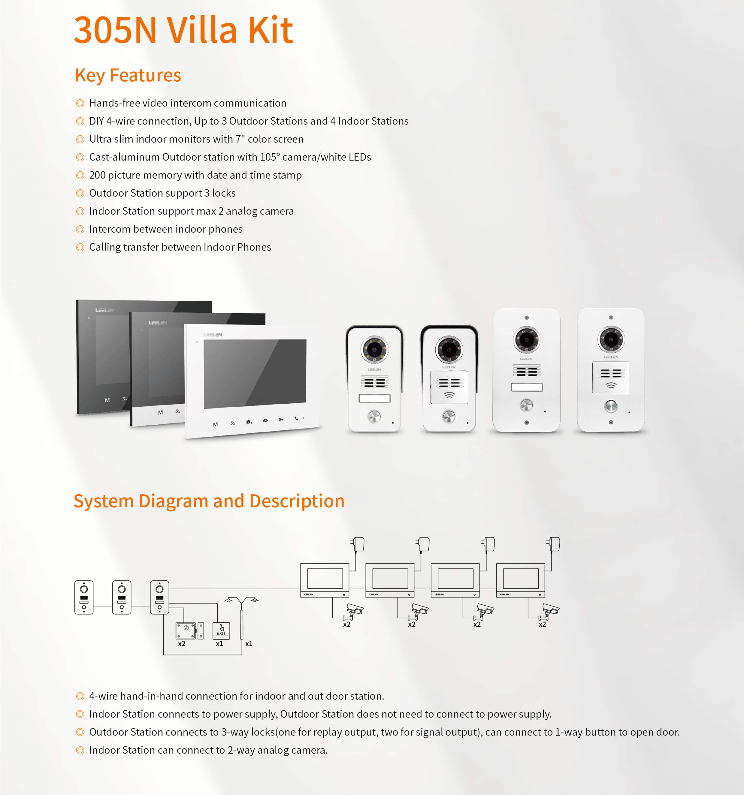 DIY 4-wire connection, Up to 3 Outdoor Stations